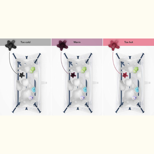 Son bouchon est thermosensible, il change de couleur pour indiquer visuellement et très facilement aux parents que l’eau du bain est trop chaude.